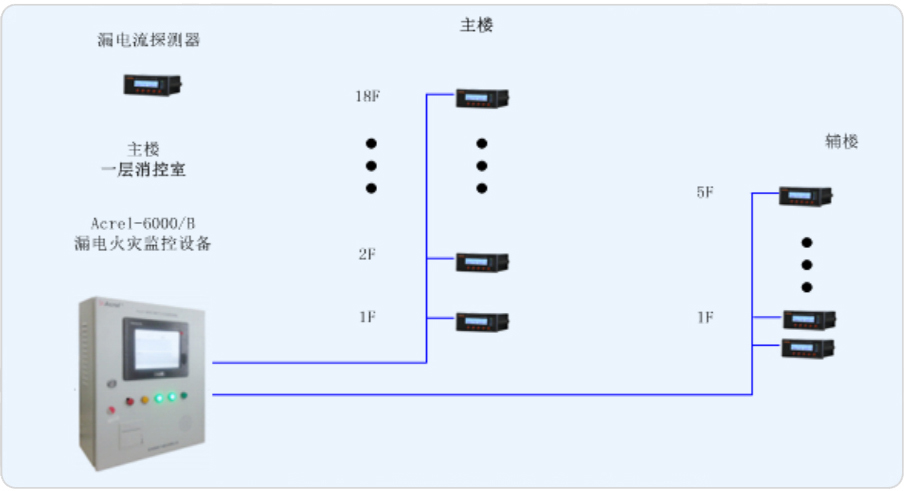針對本項目的性質及配電結構,現(xiàn)針對其主樓(18層)、輔樓(5層),兩棟樓設計一套電氣火災監(jiān)控系統(tǒng)。在主樓和輔樓的樓層配電箱的進線端安裝漏電流探測器,由此來實時監(jiān)測變電所內重要回路的漏電流,以確保變電所配電系統(tǒng)的電氣安全。