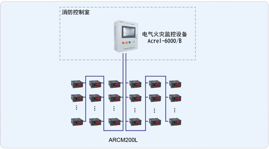 安科瑞于2014年9月承接了該項目電氣火災(zāi)監(jiān)控系統(tǒng),整套系統(tǒng)由壁掛式電氣火災(zāi)監(jiān)控裝置安科瑞Acrel-6000/B、ARCM200L剩余電流式火災(zāi)探測器組成?,F(xiàn)場低壓配電柜內(nèi)探測器采用2條485總線接至消控中心的Acrel-6000/B壁掛式電氣火災(zāi)監(jiān)控系統(tǒng),當(dāng)現(xiàn)場保護(hù)線路中的被探測參數(shù)超過報警設(shè)定值時,發(fā)出報警信號、控制信號,指示報警部位并保存報警信息。