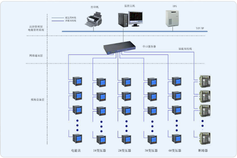 安科瑞電氣股份有限公司于2014年承接該項(xiàng)目電力監(jiān)控系統(tǒng),系統(tǒng)通過(guò)多功能的電力監(jiān)控裝置、通訊網(wǎng)絡(luò)和計(jì)算機(jī)軟件,實(shí)現(xiàn)工廠內(nèi)供配電系統(tǒng)在運(yùn)行過(guò)程中的數(shù)據(jù)采集、運(yùn)行監(jiān)視、事故預(yù)警、事故記錄和分析、電能質(zhì)量檢測(cè)、三相不平衡監(jiān)視、繼電保護(hù)等,完成工廠的安全供電、用電管理、設(shè)備管理和運(yùn)行管理。系統(tǒng)由主控層、通訊管理層和現(xiàn)場(chǎng)控制層構(gòu)成。系統(tǒng)要求盡量減少集中采集數(shù)據(jù)的裝置以保證系統(tǒng)的通訊可靠性。本次項(xiàng)目主要涉及當(dāng)陽(yáng)市蒙牛乳業(yè)有限責(zé)任公司配電室內(nèi)的網(wǎng)絡(luò)多功能儀表、電能表以及斷路器,53個(gè)回路需要監(jiān)測(cè),監(jiān)控主機(jī)位于配電室。
