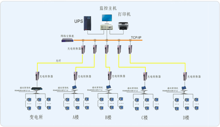 上海金橋德勤通用廠房共1個10KV/0.4KV配電房,在配電房內有0.4KV的安科瑞PZ96L-E4儀表102塊;A#有安科瑞PZ96L-E4儀表13塊,B#有安科瑞PZ96L-E4儀表8塊;C#和D#分別有安科瑞PZ96L-E4儀表4塊,上海金橋德勤通用廠房共用安科瑞儀表133塊。對于上海金橋德勤通用廠房的配電情況,在每棟大樓里安放了采集器通過光纖到A棟的消防控制室,配電房的儀表連接至安放在配電室旁邊的通訊機柜再通過光纖到消防控制室,將所有的儀表連接一起,實現(xiàn)對上海金橋德勤通用廠房用電的實時管理。