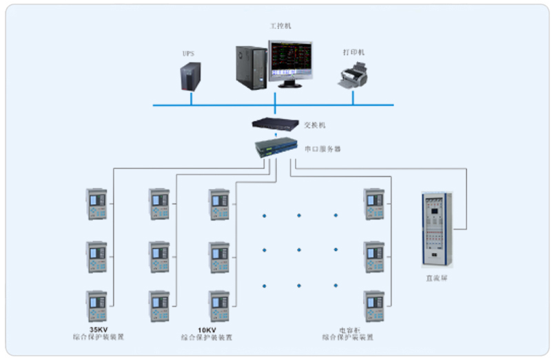 本項(xiàng)目有兩路35KV電源進(jìn)線,經(jīng)兩臺(tái)12500KVA變壓器變壓為10KV對(duì)項(xiàng)目進(jìn)行供電,系統(tǒng)采用Acrel-2000型電力監(jiān)控系統(tǒng),整個(gè)系統(tǒng)采用網(wǎng)絡(luò)分布式結(jié)構(gòu),監(jiān)控主機(jī)2層變電所值班室,綜合保護(hù)裝置、直流屏、多功能儀表等設(shè)備采用RS485總線組網(wǎng)接入變配電站內(nèi)的數(shù)據(jù)采集器,進(jìn)而接入變電站值班室電力監(jiān)控主機(jī)。該項(xiàng)目實(shí)現(xiàn)了上海徐工工程機(jī)械有限公司變電站電力系統(tǒng)的智能管理。