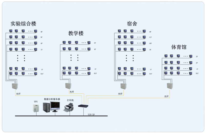 安科瑞Acrel-5000建筑能耗分析管理系統(tǒng)根據(jù)上海復(fù)旦中學(xué)西部校區(qū)現(xiàn)場實(shí)際情況,整體網(wǎng)絡(luò)結(jié)構(gòu)采用屏蔽雙絞線直接接至樓層弱電井的數(shù)據(jù)采集器然后通過光纖將數(shù)據(jù)上傳至的監(jiān)控主機(jī)。該系統(tǒng)主要采用分層分布式計(jì)算機(jī)網(wǎng)絡(luò)結(jié)構(gòu),站控管理層、網(wǎng)絡(luò)通訊層和現(xiàn)場設(shè)備層。