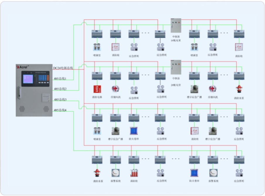 安科瑞電氣于2015年為該項目提供AFPM100小型消防設(shè)備電源監(jiān)控系統(tǒng)解決方案,該系統(tǒng)采用消防設(shè)備電源狀態(tài)監(jiān)控器+電壓/電流傳感器的兩層結(jié)構(gòu)組網(wǎng)模式,從而簡化了系統(tǒng)結(jié)構(gòu)設(shè)計。系統(tǒng)組網(wǎng)共分為站控管理層、網(wǎng)絡(luò)通訊層、現(xiàn)場設(shè)備層三層,該項目通訊總線共接入4條通訊總線,總線在樓層配電箱手拉手串接后,接入壁掛式后臺,組成消防設(shè)備電源監(jiān)控系統(tǒng)的大動脈。