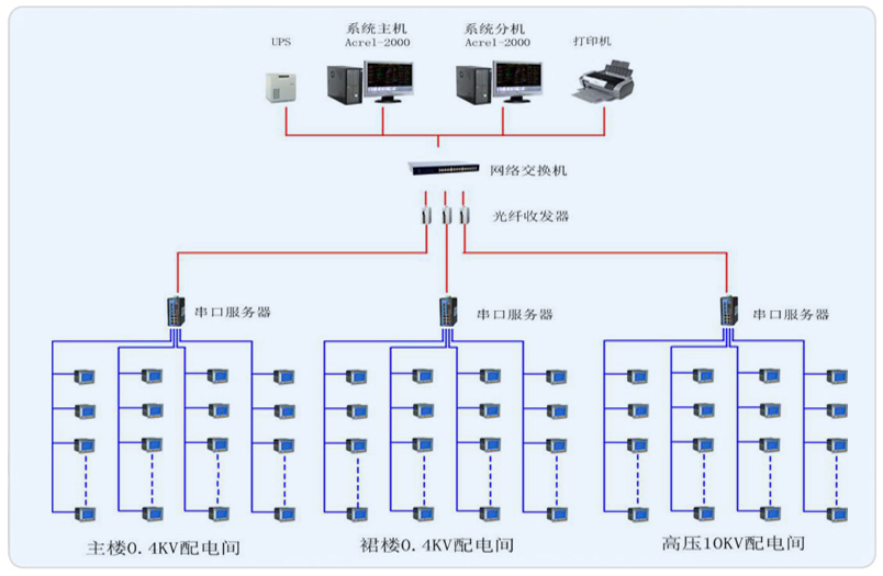 系統(tǒng)采用Acrel-2000型電力監(jiān)控系統(tǒng),整個系統(tǒng)采用網絡分布式結構,包含主樓0.4KV低壓配電室,裙樓0.4KV低壓配電室,10KV高壓配電室三個區(qū)域,3個數據采集箱。監(jiān)控主機位于主樓地下一層的辦公室,監(jiān)控分機位于主樓一層的消控中心,所有配電回路均配備安科瑞電力儀表PZ系列。該項目實現了福州郵政廣場2棟樓內電力系統(tǒng)的智能管理。所有監(jiān)控設備均通過屏蔽雙絞線至各自配電室內的串口服務器,再通過光電轉換器經過光纖將數據傳輸至主樓地下一層的辦公室,從而實現遠程監(jiān)控。