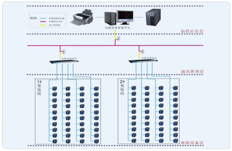 本項目主要是針對海南昌建逸海國際廣場內(nèi)的10KV/0.4KV的1#,2#變電所設(shè)計一套電力監(jiān)控系統(tǒng)。主要是采集10kV多功能網(wǎng)絡(luò)儀表電力參數(shù)、開關(guān)帶電指示儀開關(guān)狀態(tài)及0.4kV變電站多功能儀表的電參量,現(xiàn)場智能表計采用RS485總線組網(wǎng)接入電能管理系統(tǒng),系統(tǒng)主機安裝在1#變電所內(nèi)。