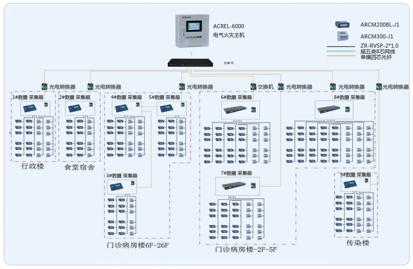 系統(tǒng)采用Acrel-6000電氣火災(zāi)監(jiān)控系統(tǒng),整個(gè)系統(tǒng)采用網(wǎng)絡(luò)分布式結(jié)構(gòu),監(jiān)控主機(jī)位于消控中心值班室門診一層,其余9個(gè)數(shù)據(jù)采集箱分布在行政樓、門診病房樓、食堂宿舍樓、感染樓,現(xiàn)場采用安科瑞ACRM系列漏電火災(zāi)儀表。所有監(jiān)控設(shè)備均通過屏蔽雙絞線至各自數(shù)據(jù)采集箱的通訊管理機(jī),再通過光電轉(zhuǎn)換器經(jīng)過光纖將數(shù)據(jù)傳輸至消控中心值班室門診一層,從而實(shí)現(xiàn)遠(yuǎn)程監(jiān)控。