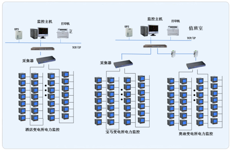 本項目根據(jù)管理區(qū)域設置兩套Acrel-2000型電力監(jiān)控系統(tǒng),系統(tǒng)采用網(wǎng)絡分布式結構,其中寶馬奧迪主機設置在地下配電值班室,酒店設置在一樓值班室。所有配電回路均配備安科瑞電力儀表PZ系列。該項目實現(xiàn)了3個變電所內(nèi)電力系統(tǒng)的智能管理。所有監(jiān)控設備均通過屏蔽雙絞線至各自配電室內(nèi)的通訊管理機,從而實現(xiàn)遠程監(jiān)控。