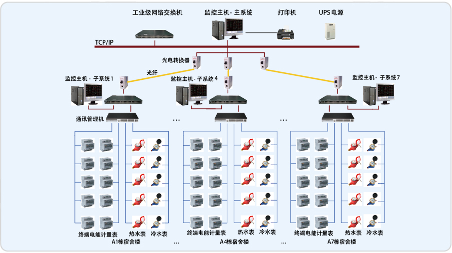 重慶廣達生活服務區(qū)能耗監(jiān)測系統(tǒng)采用網(wǎng)絡分布式結(jié)構(gòu),整個系統(tǒng)包括該建筑群的七個子系統(tǒng)和中心監(jiān)控室的一個總監(jiān)控系統(tǒng)。冷/熱水表數(shù)據(jù)和電表數(shù)據(jù)當?shù)夭杉瓿珊蠹袀髦林行谋O(jiān)控室。 分控中心和中心監(jiān)控室之間用光纖網(wǎng)絡進行通訊。每個子系統(tǒng)采用五臺通訊管理機,其中三臺通訊管理機采集樓內(nèi)每戶的冷/熱水表數(shù)據(jù),另外兩臺采集樓內(nèi)電表的數(shù)據(jù)。