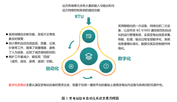 變電站綜合自動化系統(tǒng)是指完成以下基本功能: l 從當?shù)睾瓦h方獲取電力系統(tǒng)信息; l 支持當?shù)厥謩雍妥詣庸δ埽?/span> l 在變電站自動化系統(tǒng)和電網(wǎng)管理系統(tǒng)之間,提供與開關設備的通信連接和接口。 這些功能可以由大量裝用的智能電子設備(IED)不同程度的組合來實現(xiàn)。 變電站綜合自動化系統(tǒng)的發(fā)展主要經(jīng)歷了三個階段; 1)歷史上,開關設備和網(wǎng)絡管理系統(tǒng)的接口是在各變電站的遠方終端單元(RTU)。RTU是一個集中單元,含有大量的輸入與輸出,基本沒有當?shù)毓δ?,但是具有與遠方網(wǎng)絡控制系統(tǒng)的通信功能。結構上僅是站級概念,現(xiàn)場有關重要信息(如保護動作信息等)通過硬接點送給RTU裝置,變電站的監(jiān)測量一般經(jīng)變送器變換后送給RTU,開關量監(jiān)測是直接引至RTU,RTU的控制輸出一般經(jīng)遙控執(zhí)行柜發(fā)出控制命令。整體系統(tǒng)功能不強、硬件設備重復、整體性能指標低、適合于老系統(tǒng)改造。 2)相比與RTU,變電站自動化系統(tǒng)以不同程度的分散結構實現(xiàn)上述基本功能,通過這些功能可對變電站進行管理,實現(xiàn)從線路隔離與接地到收集狀態(tài)監(jiān)測數(shù)據(jù)等所有自動化功能。RTU的通信功能在變電站自動化發(fā)展中變?yōu)橥ㄐ沤涌冢赏ㄐ啪W(wǎng)關執(zhí)行,根據(jù)所用的通信協(xié)議,網(wǎng)關將規(guī)約雙向轉換(即規(guī)約轉換器),在變電站自動化分布式智能電子設備中存儲的信息通過網(wǎng)關傳送給SCADA主站與遠方調度電網(wǎng)管理系統(tǒng)。 3)隨著信息技術已經(jīng)進步到可以實現(xiàn)廣域保護,依靠協(xié)調防御計劃來保護整個電力系統(tǒng),以及IEC61850作為《變電站通信網(wǎng)絡和系統(tǒng)》的新國際標準,數(shù)字化變電站將以三層兩網(wǎng)式部署,三層分別是指站控層設備、間隔層設備和過程層設備,兩網(wǎng)分別是指站控層網(wǎng)絡和過程層網(wǎng)絡。間隔層包括數(shù)字式保護、計量、監(jiān)控等二次設備,負責間隔內信息的運算處理與控制,以及與過程層和站控層之間的網(wǎng)絡通信工作;過程層主要包括電子式互感器、合并單元、智能斷路器、智能開關、智能終端,該層主要實現(xiàn)信號的采集和對系統(tǒng)的操作控制。三層設備之間通過分層、分布、開放式的兩層網(wǎng)絡實現(xiàn)連接,兩層網(wǎng)絡物理上相互獨立,站控層網(wǎng)絡構建為全站統(tǒng)一的MMS網(wǎng),過程層網(wǎng)絡則包括GOOSE網(wǎng)和SV網(wǎng)。但數(shù)字化變電站設置了大量的智能終端、交換機等過程層設備,使得整體動作延時增加、網(wǎng)絡復雜。 圖1 變電站綜合自動化系統(tǒng)發(fā)展歷程圖
